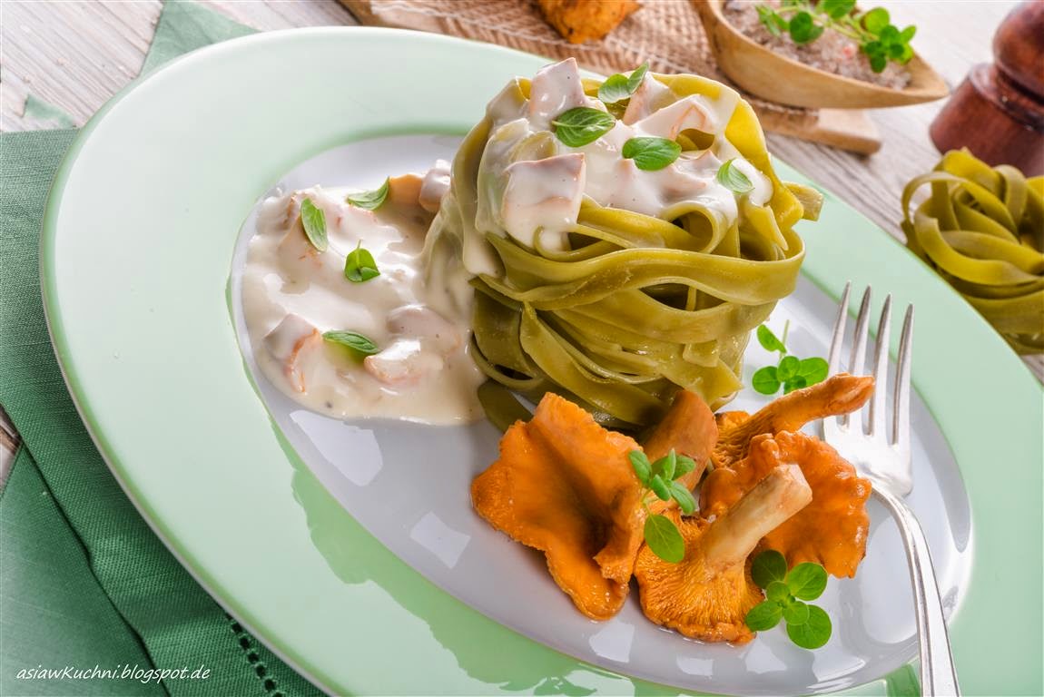 Tagliatelle szpinakowe z sosem śmietanowo- kurkowym.